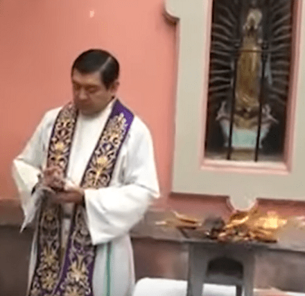 Fr. Valdemar stood next to an altar-boy who was holding an image of Our Lady of Guadalupe and explained what was about to take place, as captured by the Nov. 3 video. The priest was also flanked by an icon of St. Michael the Archangel.