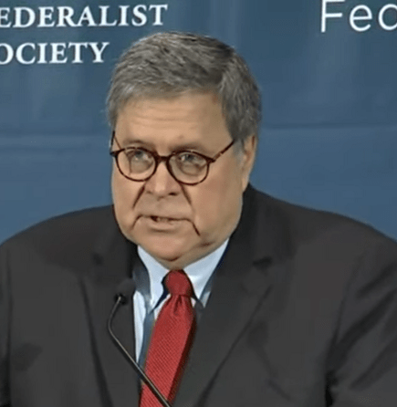 U.S. Attorney General Bill Barr delivers the Barbara K Olson Lecture at the Federalist Society’s 2019 National Lawyers Convention. This takes place amid the second day of the public impeachment proceedings.
