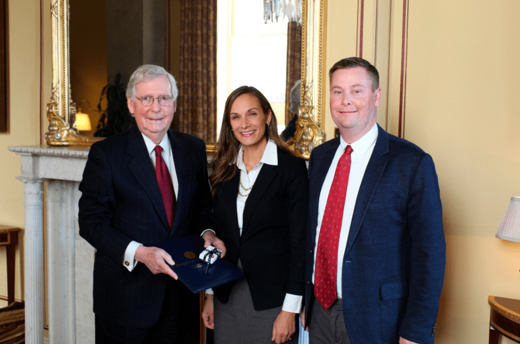 Photo: Mitch McConnell; Senator McConnell welcomes parents, Angie and Chris Thomas, to his Leadership Office in the U. S. Capitol.