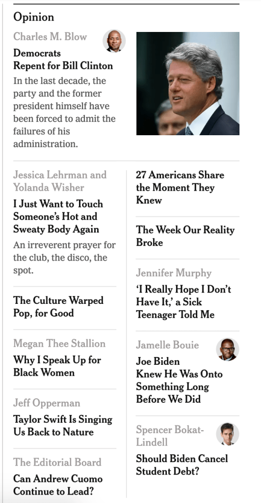 Exhibit 1. Scroll down to the editorial, “Can Andrew Cuomo Continue to Lead?” The editorial board, the solemn voice of America’s newspaper of record, answers, basically “No way José”. Let’s zoom in on the frenzy over allegations of sexual harassmement: