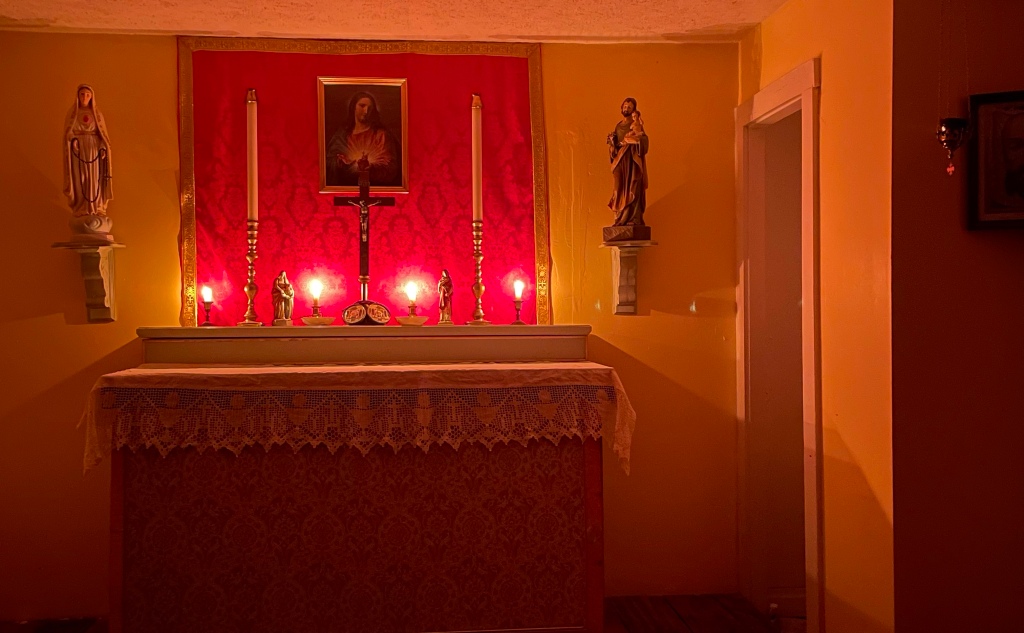 Our house is small and…odd. The front room was designed to be the living room. Now it’s our chapel, a tiny kitchen for preparing (but not cooking) food. The food is cooked either on a home-built wood grill outside or the old Jòtul stove in the house. We have a tiny parlor that doubles as a sacristy. No tv or radio, just an old iPad and our phones.
