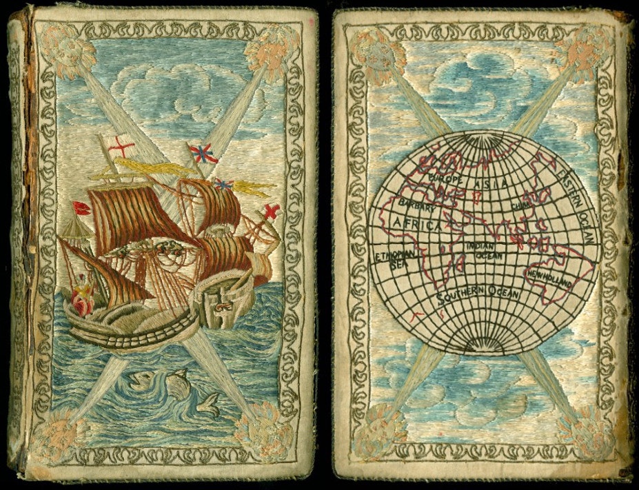 One of Davenport’s chief examples is a manuscript of The Miroir or Glasse of the Synneful Soul, copied out by the hand of then-Princess Elizabeth and potentially covered and decorated by her as well. The manuscript was a gift to her stepmother, Katherine Parr, and features the queen’s initials surrounded by hearts-ease flowers. Davenport writes this book into a patriotic domestic history that blends writing and embroidery, emphasizing the relatively amateur quality of the work — not likely to be the work of a hired professional — which aligns with expectations of amateur expertise applied to Victorian women’s needlework.