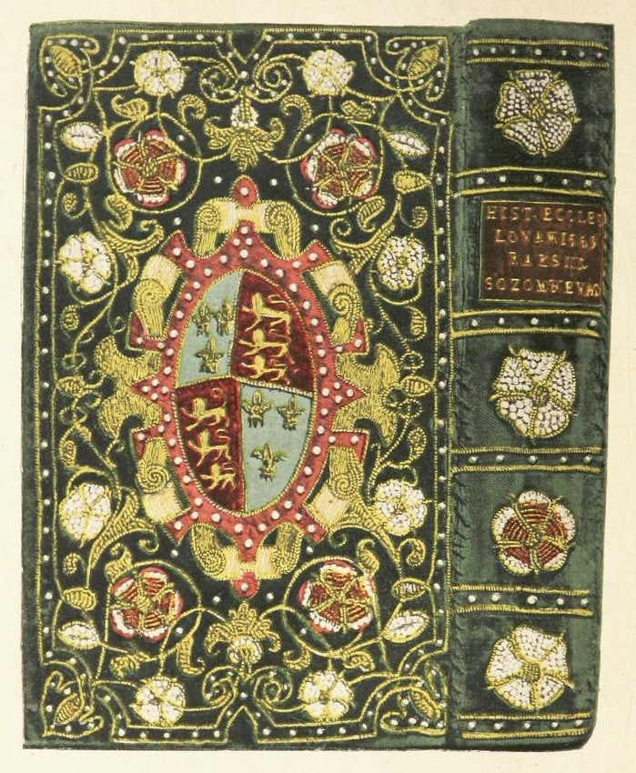 Davenport’s volume reproduces images of fifty-two books, some in color but most in half-tint black and white. The plates and their accompanying descriptions are organized first according to fabric type — canvas, velvet, or satin — and then chronologically. Working from original photographs, Davenport tinted some and added embellishments to others for better visual effect. One color print is of a beautiful copy of Christopherson’s Historia Ecclesiastica, owned by Queen Elizabeth I. The three volumes are bound in matching deep green velvet and are delicately embroidered with the royal coat of arms, Tudor and York roses, and a scattered field of small pearls. A colored photograph of one volume serves as the frontispiece to Davenport’s book, and he admits to doctoring the photograph in order to restore some of the missing pearls.