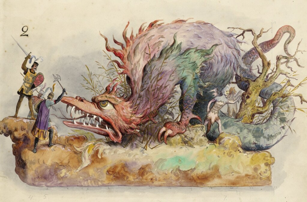 “D for Dragon” float design by Bror Anders Wikstrom for the “Alphabet” theme, Krewe of Proteus, 1904: Carnival Collection, Louisiana Research Collection, Tulane University — Source