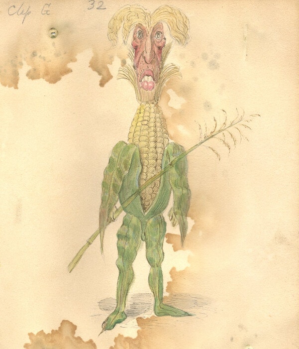 Corn costume designed by Charles Briton for the “Missing Links” theme, Mistick Krewe of Comus, 1873: Carnival Collection, Louisiana Research Collection, Tulane University — Source