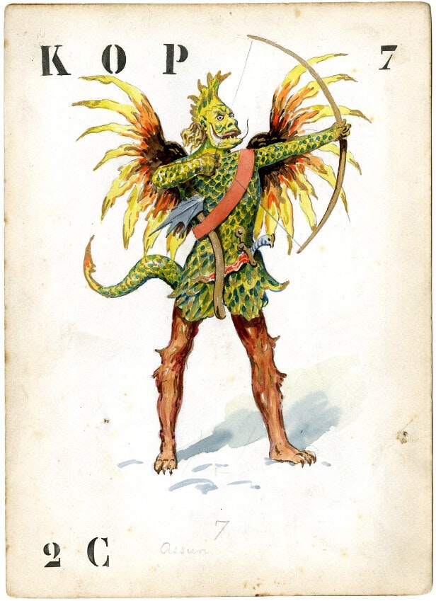 Wikstrom started as an assistant to a fellow Swedish immigrant, Charles Briton. Briton arrived in New Orleans in 1865, and worked for a time with lithographer Emile Boehler, eventually devoting his artistic talents to Carnival. While he designed floats, invitations, and all the other Krewe materials, his costumes are the most ingenious. His 1882 “Ancient Egyptian Theology” illustrations for the Krewe of Proteus morphed participants into a hieroglyphic-adorned Horus and Anubis, and the 1873 “Missing Links” for Comus metamorphosed humans into beetles, coral polyps, ears of corn, grasshoppers, and leeches.
