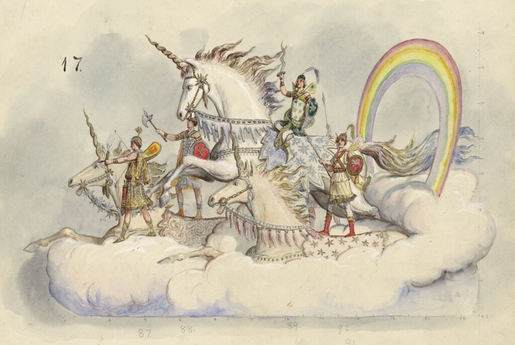 “U for Unicorn” float design by Bror Anders Wikstrom for the “Alphabet” theme, Krewe of Proteus, 1904: Carnival Collection, Louisiana Research Collection, Tulane University — Source