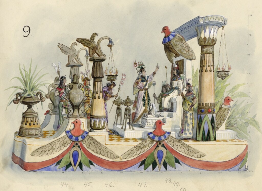 “Crowning of the Pharaoh” float design by Bror Anders Wikstrom for the “Cleopatra” theme, Krewe of Proteus, 1903: Carnival Collection, Louisiana Research Collection, Tulane University — Source