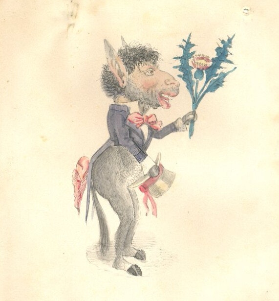 Darwin as an ass costume designed by Charles Briton for the “Missing Links” theme, Mistick Krewe of Comus, 1873: Carnival Collection, Louisiana Research Collection, Tulane University — Source.