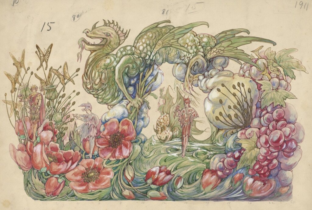 For Comus’ 1911 “Familiar Quotations” she positioned couples on the “What are the wild waves saying” float gazing at a torrent of water from pearlescent shells; and butterflies, gargantuan poppies, a sea serpent, and botanical forms swept in a current of foliage on “Such stuff as dreams are made of”.