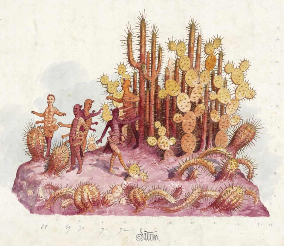 In 1913, Wilde died at the age of 48 while on a trip to England. Her final designs for “Tales From Chaucer” appeared in 1914, debuting the very night she was interred in New Orleans’ Metairie Cemetery. In addition to Wilde, there were several other women who had a major role in Carnival art. Carlotta Bonnecaze created dazzling scenes with an air of science fiction, such as the 1886 parade “Visions of Other Worlds” for Krewe of Proteus, with lightning-wielding extraterrestrials riding on a comet, six-armed beings wandering a Saturn covered with prickly cacti, and a desolate moon where wizened figures seem frozen in gray craters.