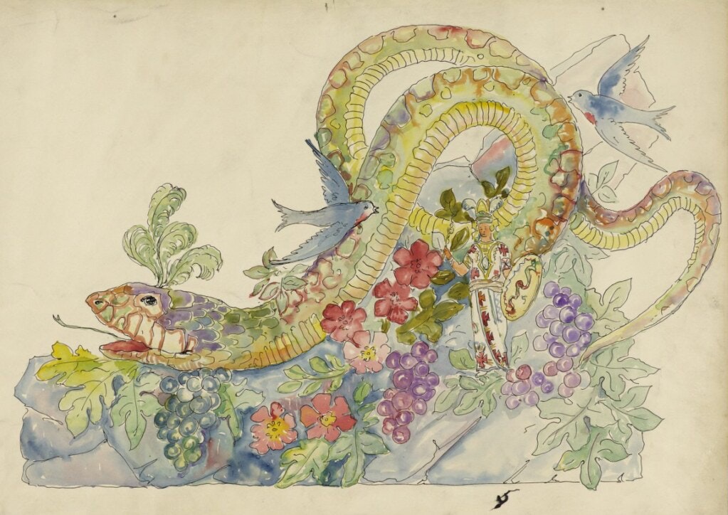 “The Feathered Serpent” float design by Léda Hincks Plauché for the “The Fair God” theme, Krewe of Proteus, 1926: Carnival Collection, Louisiana Research Collection, Tulane University — Source