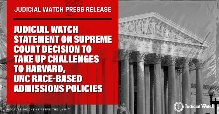 (Washington, DC) – Judicial Watch President Tom Fitton made the following statement regarding the U.S. Supreme Court’s decision to hear challenges to race-based admissions practices at Harvard and the University of North Carolina: