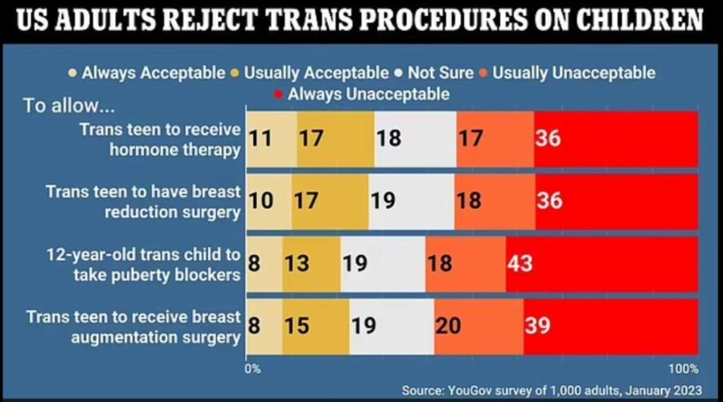 In addition, a recent YouGov survey of 1,000 adults across the nation found that Americans were largely against so-called “gender-affirming” procedures for children.