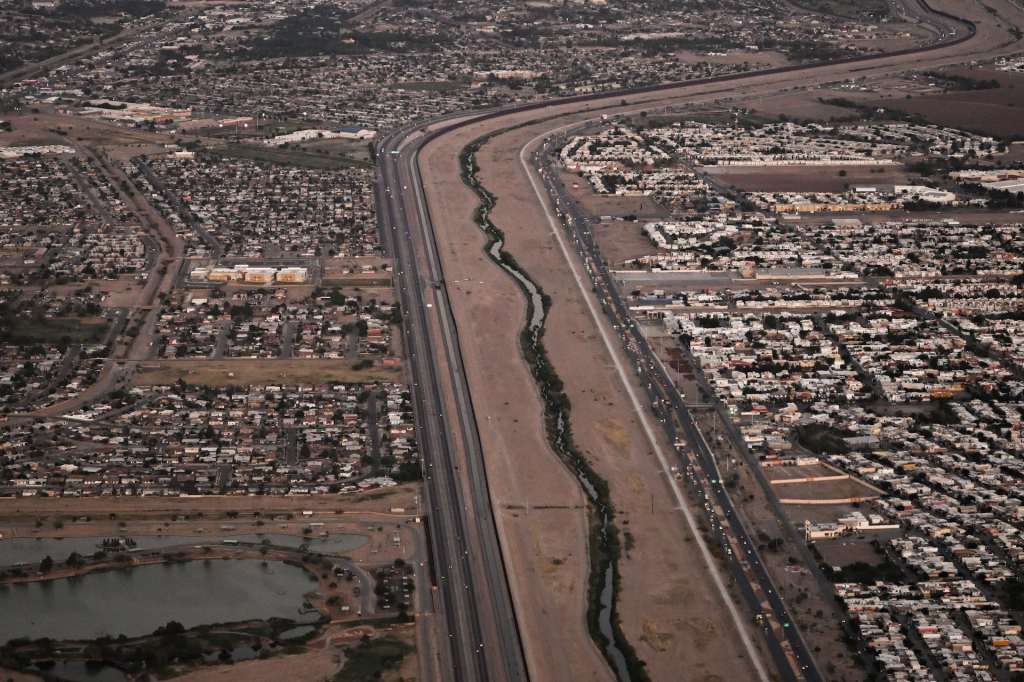 In an aerial image taken on May 12, 2023, a border wall and concertina wire barriers stand along the Rio Grande river between Ciudad Juarez, Mexico, left, and El Paso, Texas. Patrick T. Fallon/AFP via Getty Images